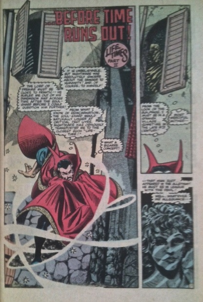 The early Doctor Strange, stories, of course, manifest these latent fears and anxieties in Steve Ditko’s angular, disembodied images. Doctor Strange #52, however, features a story written by Roger Stern with artwork by the formidable and influential duo of the late Marshall Rogers on pencils and Terry Austin on inks. “Life-Times” is a story of reincarnation in which, the first text box of page 1 tells us, “Time has no meaning!” Marshall and Austin have designed a page which illustrates and embodies this opening statement as they reject a more traditional, grid-like structure in favor of a collection of circular, elliptical panels: in the first image in the upper left-hand corner of the page, Doctor Strange and Clea have just “saved Morgana Blessing from the Dread Dormammu amid the rubble of war-torn London.” Then Stephen Strange and Clea appear at Blessing’s bedside in a hospital in New York City: