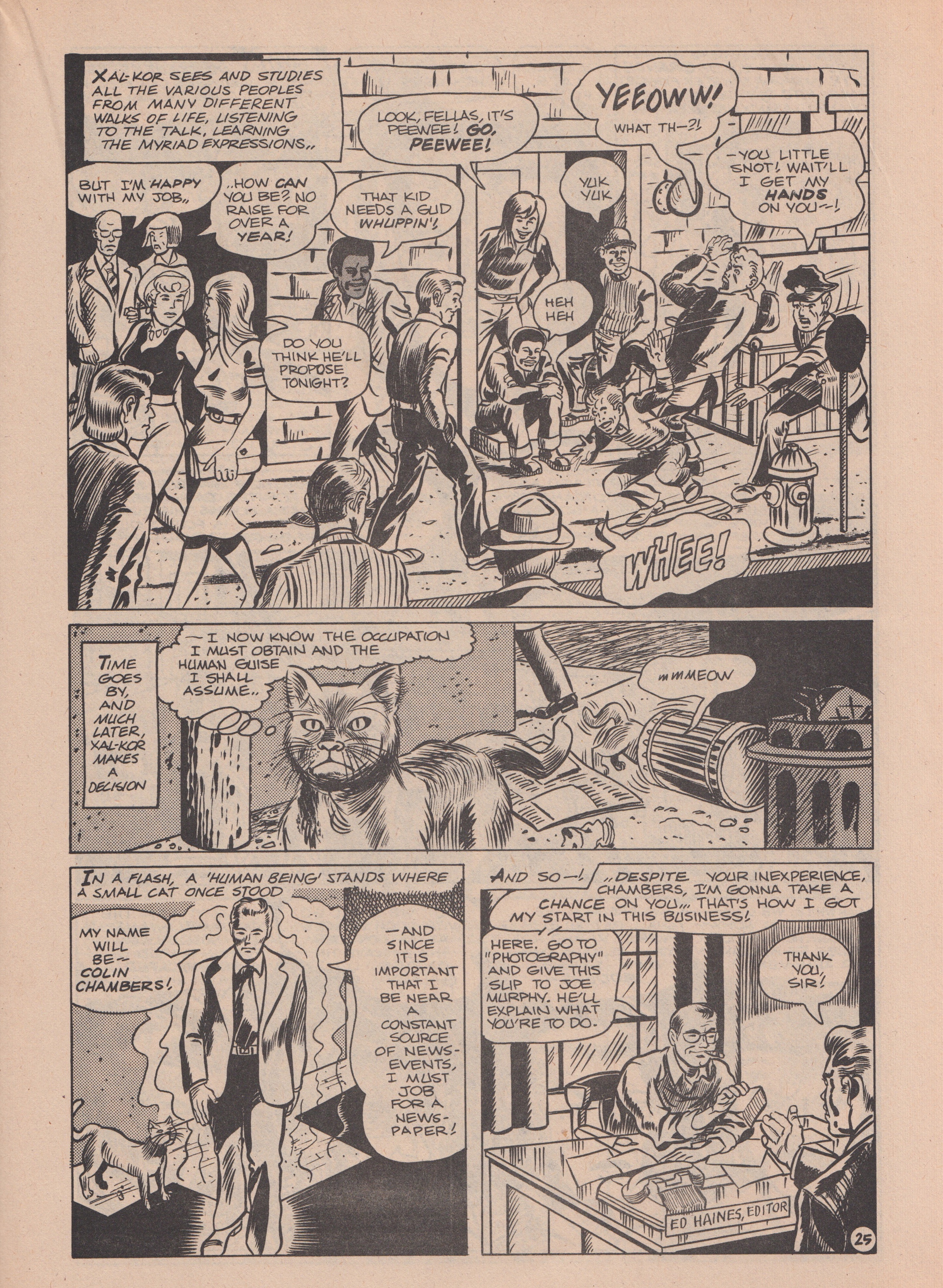 Over the course of 31 pages, most of them filled with advertisements, Namor battles two surface-dwellers, one of whom attacks because, he explains, “we don’t need any crummy fish-men hanging out around here!” There’s a green space creature who blinds the Sub-Mariner and then miraculously restores our hero’s sight a few pages before the end of the story. Finally, there’s an almost happy ending, as the more tolerant of the two dock-workers rescues his friend and exclaims, “Let’s go back to my pad and have a few drinks. I just bought a new professional wrestling magazine!” Is this another narrative, one embedded in the text—two young men cruising, one tolerant, the other filled with hatred of himself and of anyone else who represents difference?