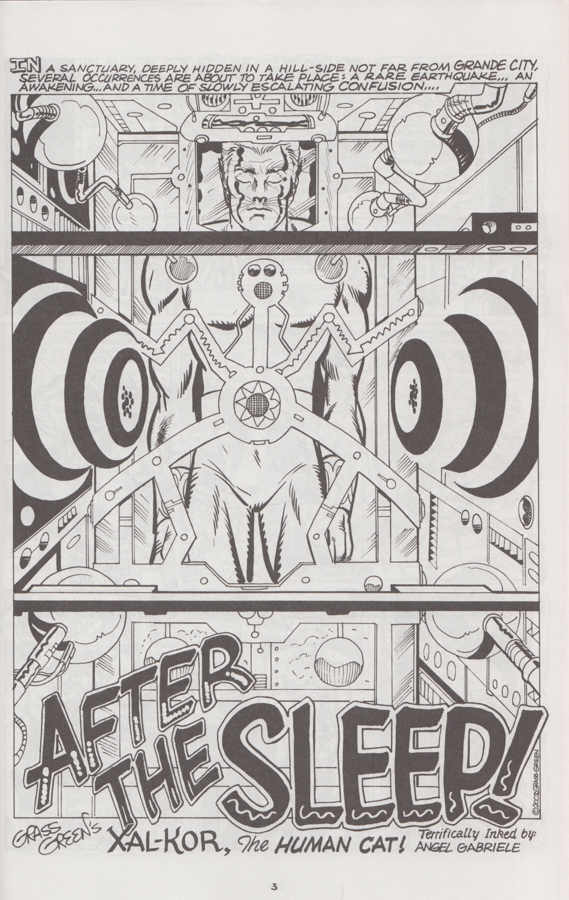 In rest of the comic, there is a sometimes awkward relationship between word and image—Skeates’ elaborate prose juxtaposed with Adkins’ large, sparsely detailed panels, often in grids of three.